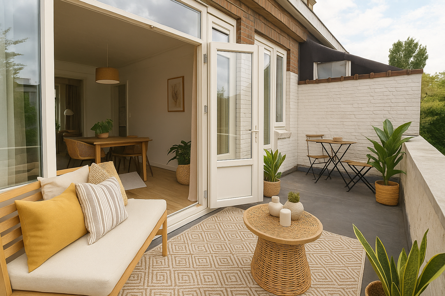 Twee royale buitenruimtes: een ruim terras aan de achterzijde en een balkon aan de voorzijde, samen goed voor ca. 25 m². Ideaal om buiten te tafelen, te relaxen of te genieten.