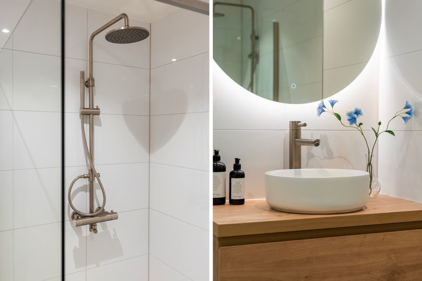 De badkamer is modern en strak afgewerkt, voorzien van een inloopdouche en stijlvol wastafelmeubel. Daarnaast is er een separaat toilet en een praktische berg- en stookruimte, waar zich ook de opstelling voor de wasmachine en droger bevindt.