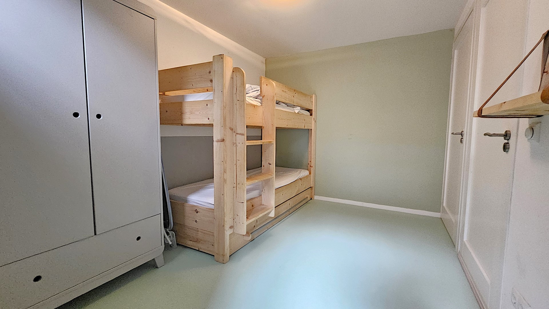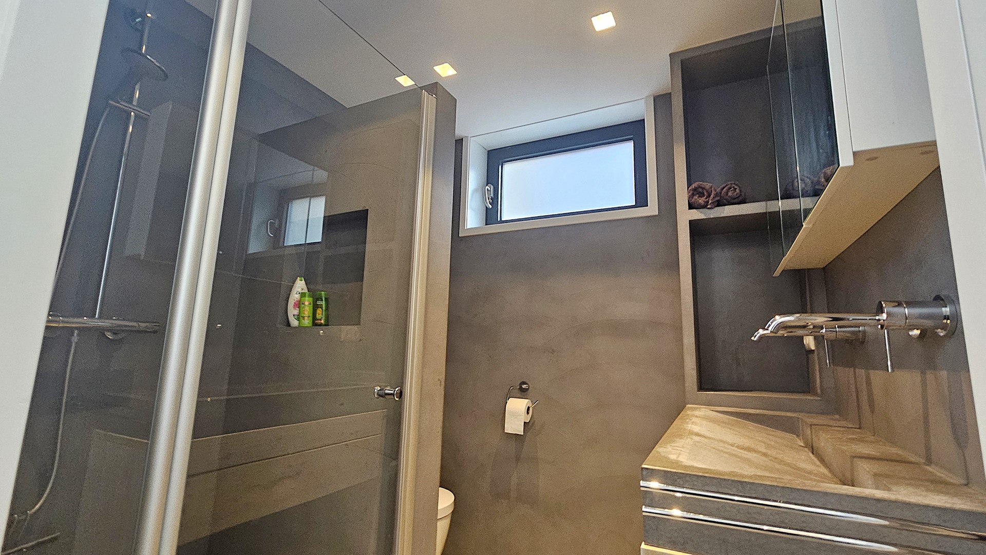 In the souterrain, accessible via a staircase from the living room, you’ll find two additional bedrooms and a second bathroom. This modern bathroom includes a walk-in shower, toilet, and an extra-large washbasin with vanity unit – perfect for those who appreciate space and comfort.