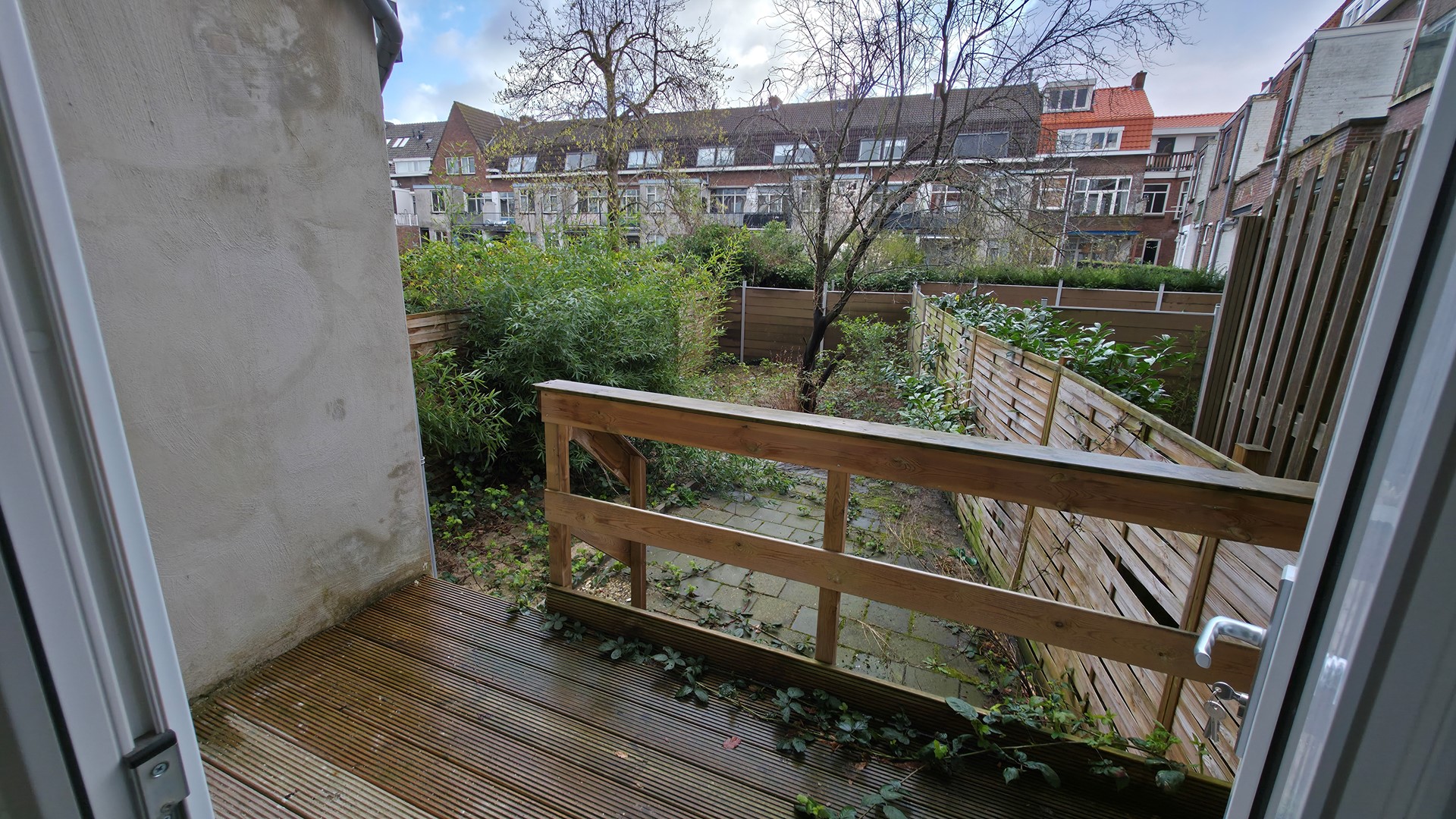 Aan de achterzijde bevinden zich twee goed bemeten slaapkamers, beide met directe toegang tot de achtertuin. Deze buitenruimte biedt voldoende plek om te ontspannen, een zitje te creëren of in alle rust van het stadsleven te genieten.