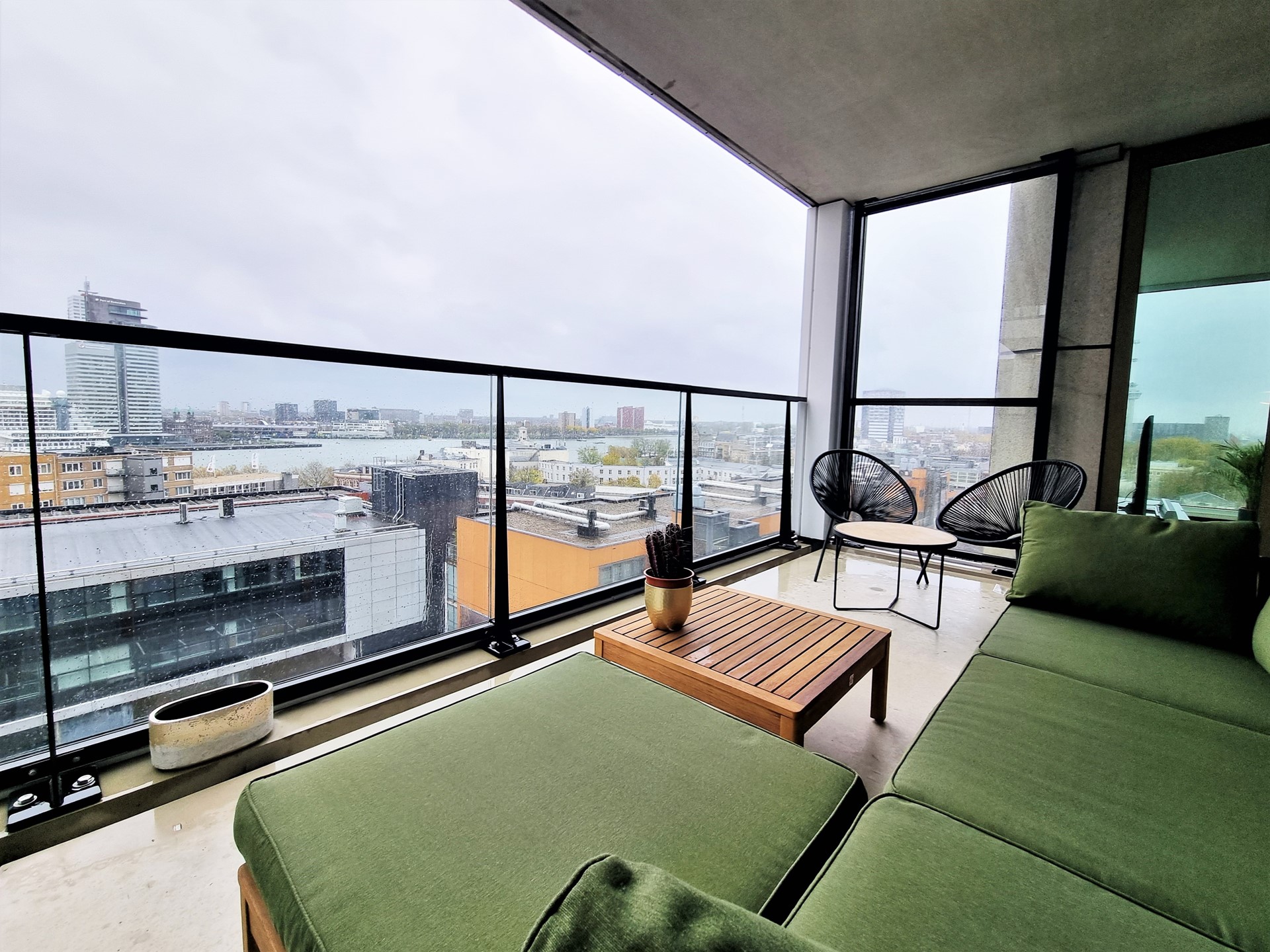 The lovely south-facing terrace can also be accessed from the sitting/dining area in the living room. Here is a beautiful wooden lounge set so that on sunny days you can enjoy the setting sun and the view over the Wilhelminapier until the wee hours.