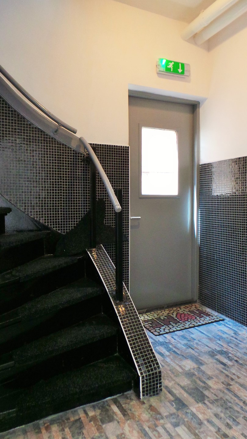 Entree via afgesloten brandpoort naar gezamenlijke portiek...