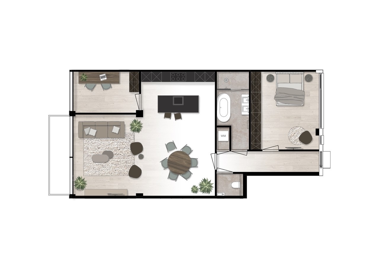 Een lichte, ruime woonkamer met open keuken van maar liefst 50 m², perfect om te ontspannen of gasten te ontvangen. Via de schuifpui stap je zo het zonnige balkon op van ca. 10 m².