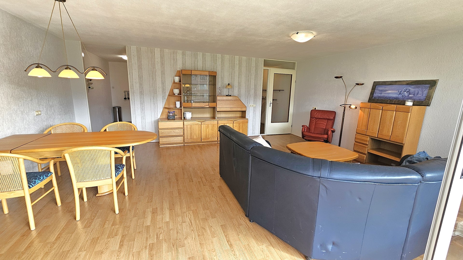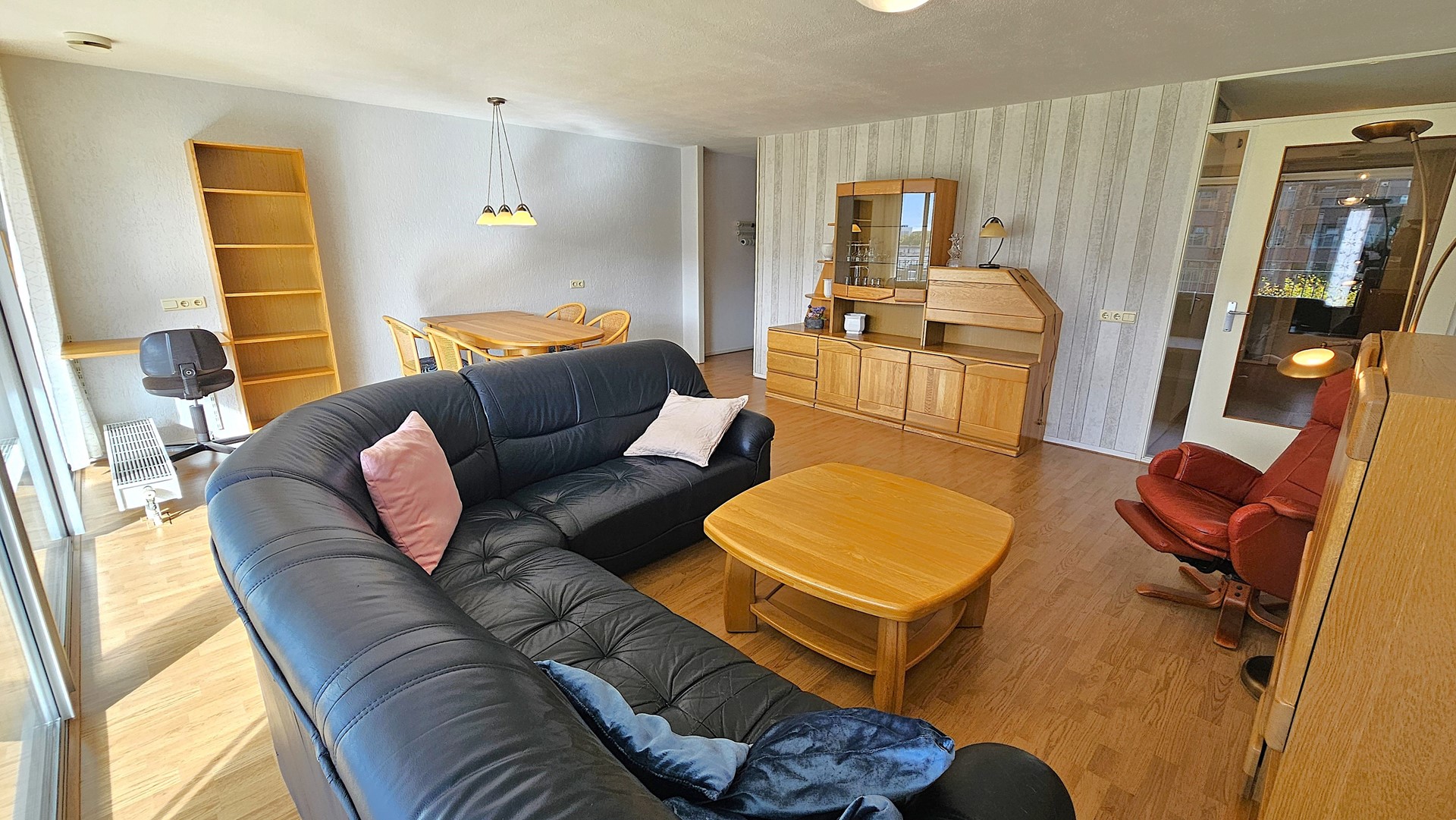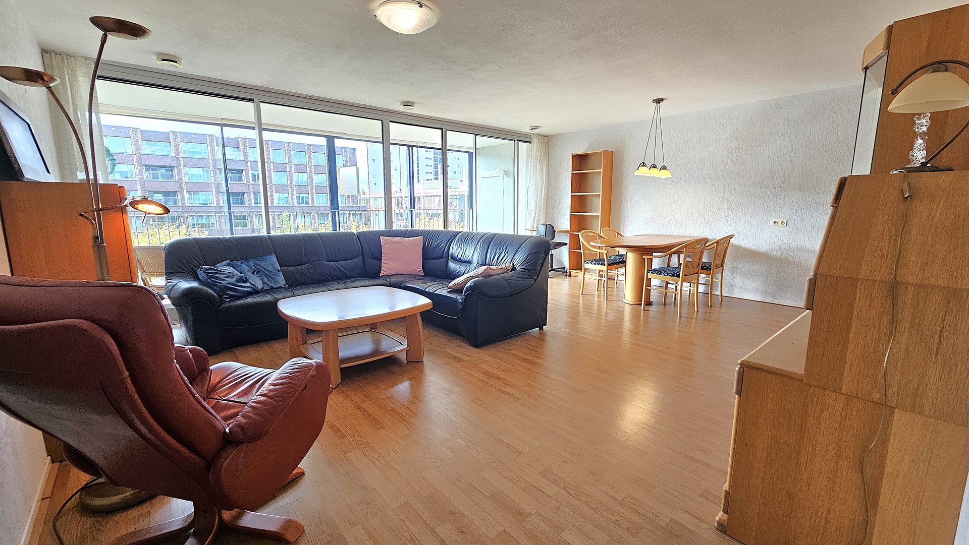 De woonkamer is ruim opgezet en biedt plaats aan een comfortabele zithoek en royale eethoek. Dankzij de grote raampartijen is er een overvloed aan natuurlijk licht en heb je een prachtig uitzicht over de levendige omgeving.
