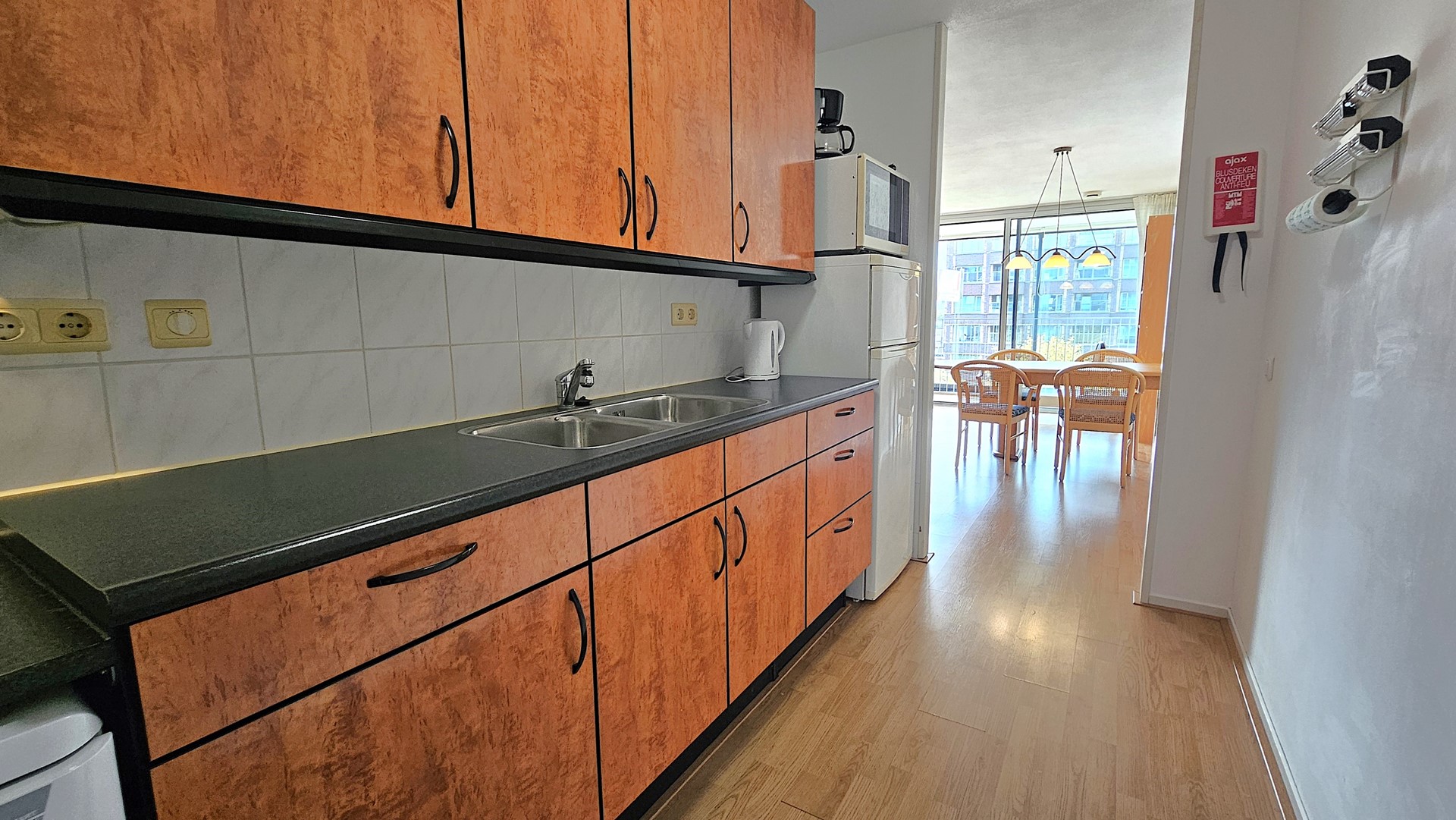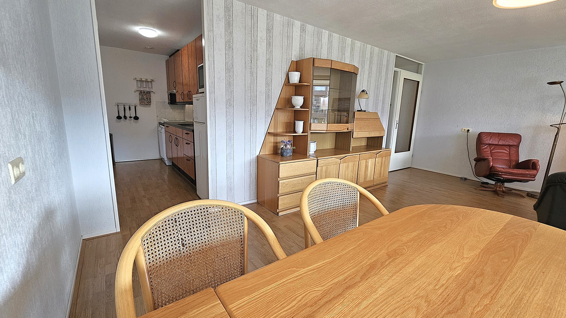 De halfopen keuken sluit hier naadloos op aan: praktisch ingericht, met voldoende werk- en kastruimte, ideaal voor wie graag kookt en tegelijkertijd in contact blijft met gasten of gezin.