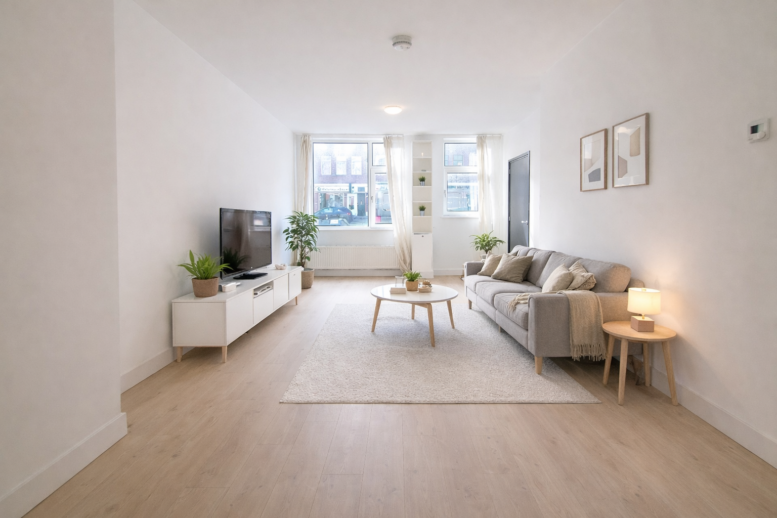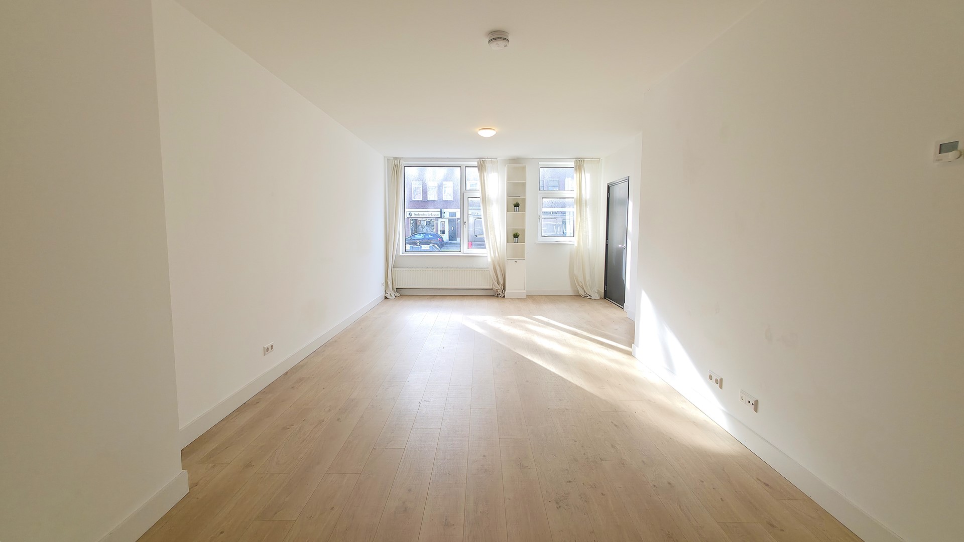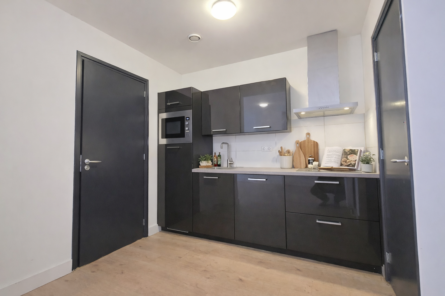Je stapt direct vanaf de straat je woning binnen via de eigen entree. Binnen valt meteen de lichte woonkamer op, met voldoende ruimte voor een gezellige zithoek en eettafel. De open keuken vormt een strak geheel met de woonruimte en is uitgevoerd in modern zwart met inbouwapparatuur. Een eigentijdse basis waar je zo in kunt – zonder klussen of extra kosten.